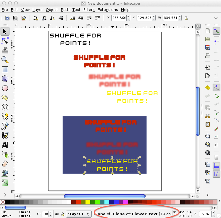 What we will do is replace the text with a nice image with colors and effects. We will be doing it the clever way too, using clones so that everything is derived from a single original object that can be modified afterwards.