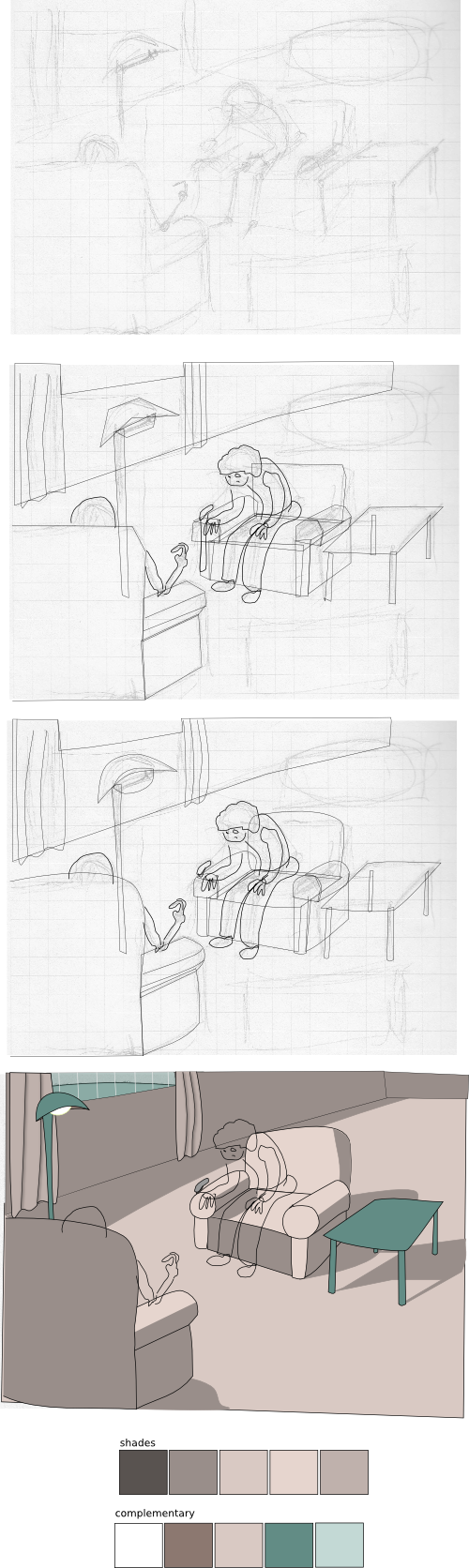 I decided to combine that with a different approach: create shadows as just basic shapes with color and put them in the same layer as the rest of the picture, as regular ‘citizens’ in the drawing. That means I can draw the shadow of a table and then put a table on top of it, without having to spend too much time trying not to accidentally draw over the table while shading.